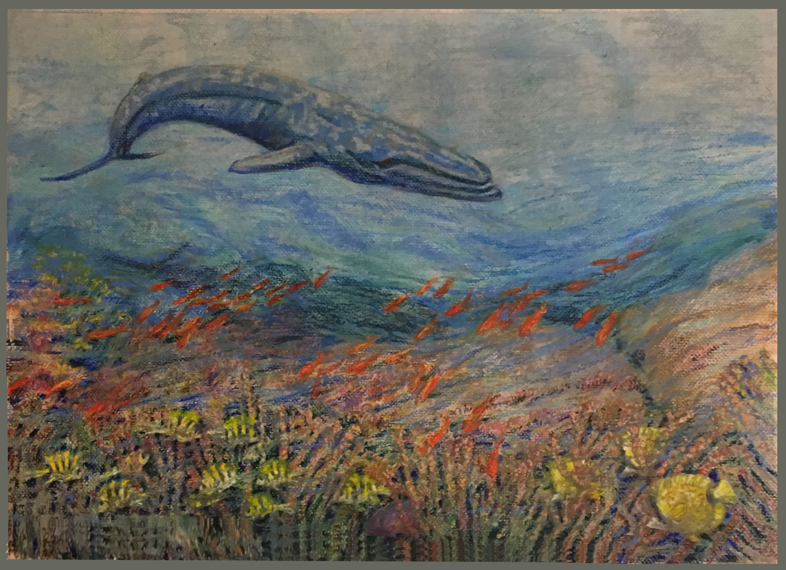 Blue Whale and Coral Reef, c. 2017, oil pastel 24 X 17